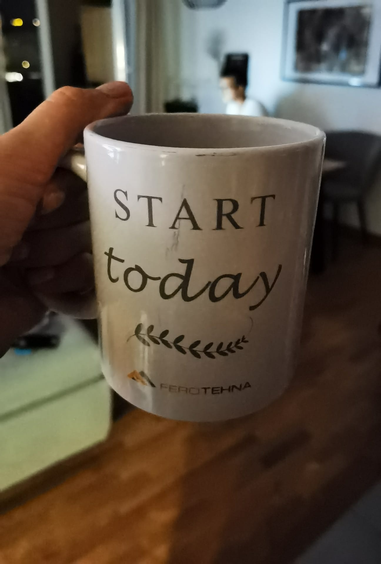 Prekinula sam nam tišinu sa sjećanjem na sve naše odluke i tako smo se zajedno zahvalno prisjećali svega onoga što smo prošli. Gle, čak i pijem čaj iz šalice koja je točno u tom tonu, kažem mu. Šalica iz starog stana. Na šalici piše START TODAY. Točno to, jedan dan smo odlučili i sad smo tu.